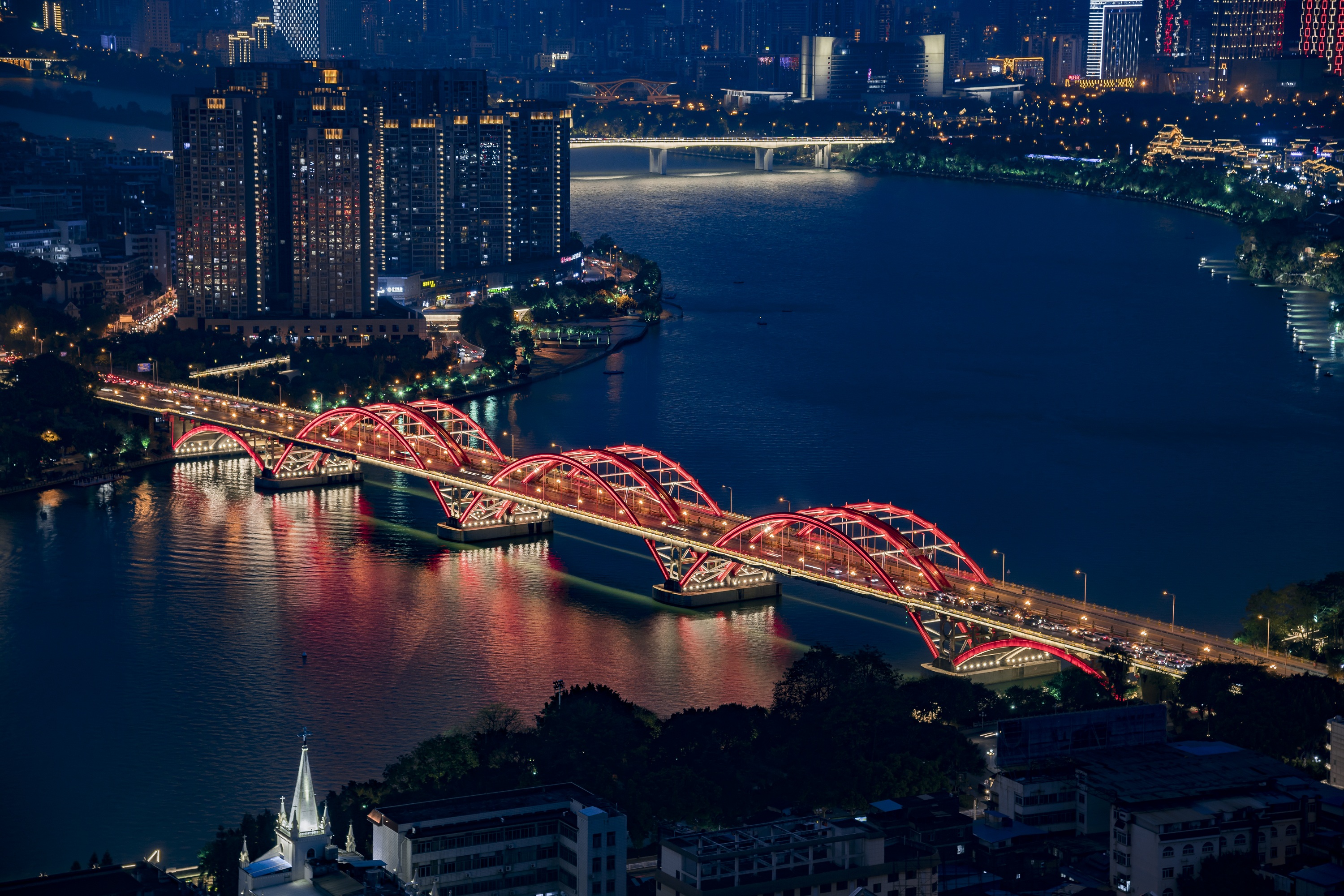 柳州作為廣西最大的工業(yè)城市的同時(shí)又是風(fēng)景秀麗的歷史文化名城,因柳江在其境內(nèi)得名。朗明智誠(chéng)為其境內(nèi)的柳江河兩岸的7座山體、9座橋梁、332棟樓梯建筑、21.4公里景觀帶進(jìn)行夜景燈光運(yùn)維服務(wù)。柳州的亮化,是將科技與文化融合,使柳州更具風(fēng)采。